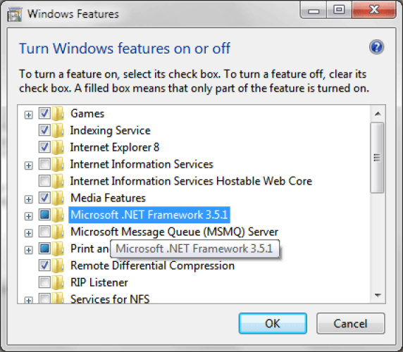 - Select "Microsoft .NET Framework 3.5.1" and click OK