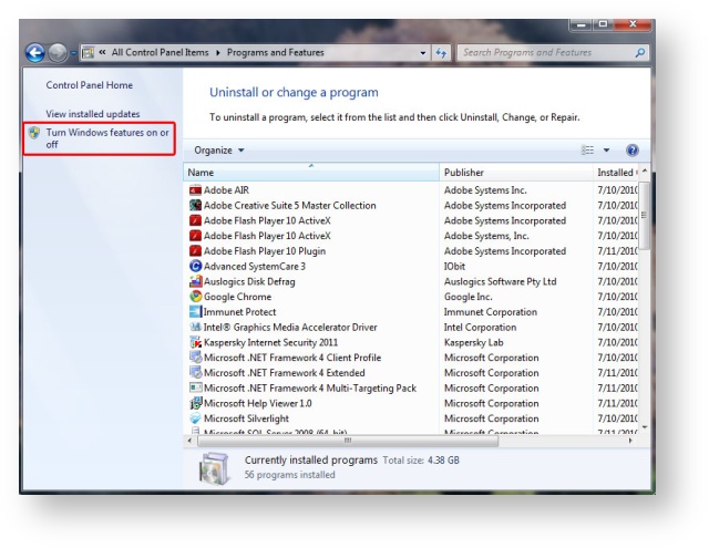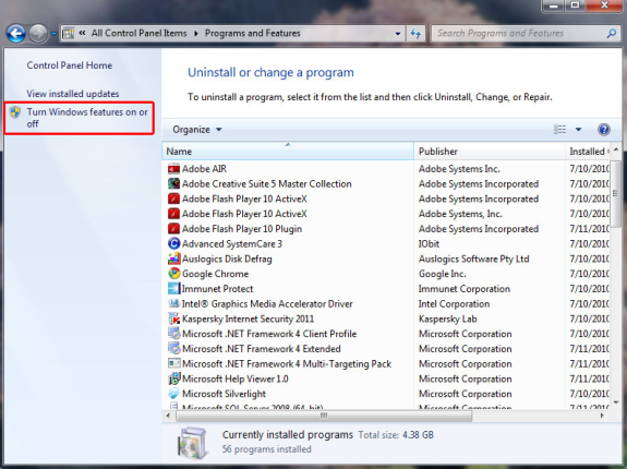 - Select "Turn Windows Features on or off" from the side pane.